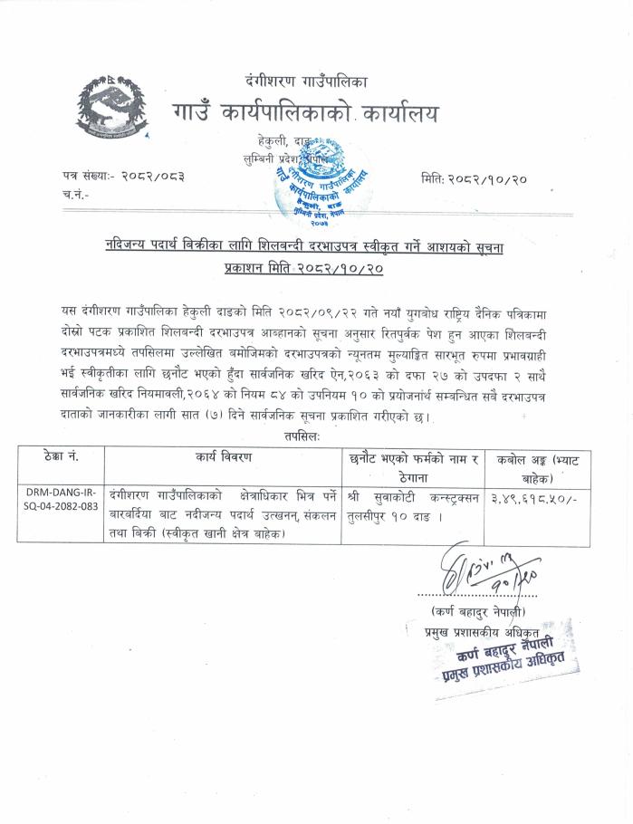 नदिजन्य पदार्थ विक्रिका लागि शिलबन्दी दरभाउपत्र स्वीकृत गर्ने आशयको सूचना ।