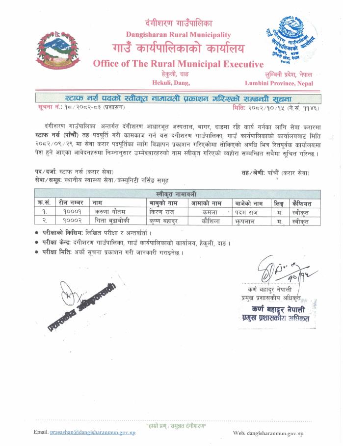 स्टाफ नर्स पदको स्वीकृत नामावली प्रकाशन गरिएको सम्बन्धी सूचना ।