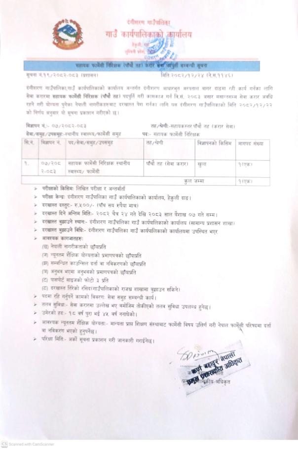 सहायक फार्मेसी निरीक्षक (पाँचौ तह) करार सेवा पदपूर्ती सम्बन्धी सूचना ।
