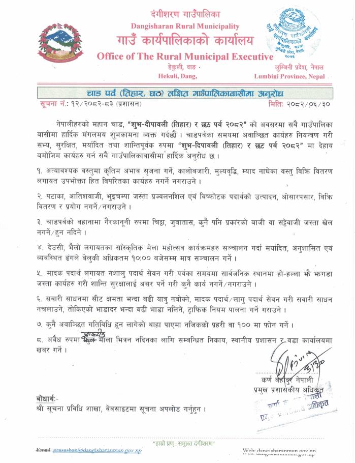 चाड पर्व (तिहार, छठ) लक्षित गाउँपालिकाबासीमा अनुरोध ।