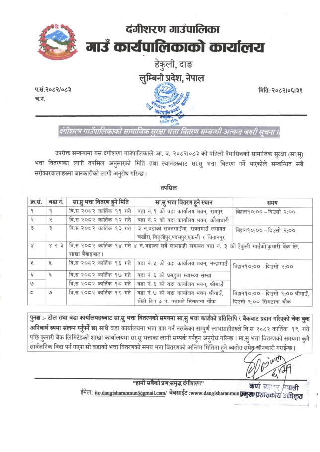 दंगीशरण गाउँपालिकाको आ.व. २०८२।०८३ को पहिलो त्रैमासिक सामाजिक सुरक्षा भत्ता वितरण सम्बन्धी सूचना ।