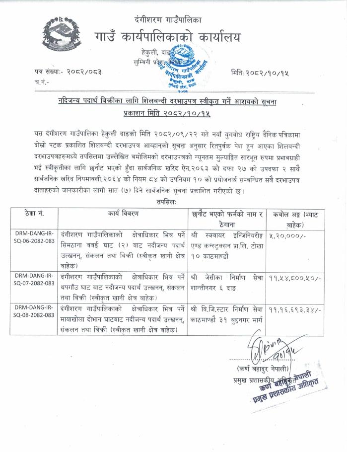 नदिजन्य पदार्थ बिक्रीका लागि शिलबन्दी दरभाउपत्र स्वीकृत गर्ने आशयको सूचना ।