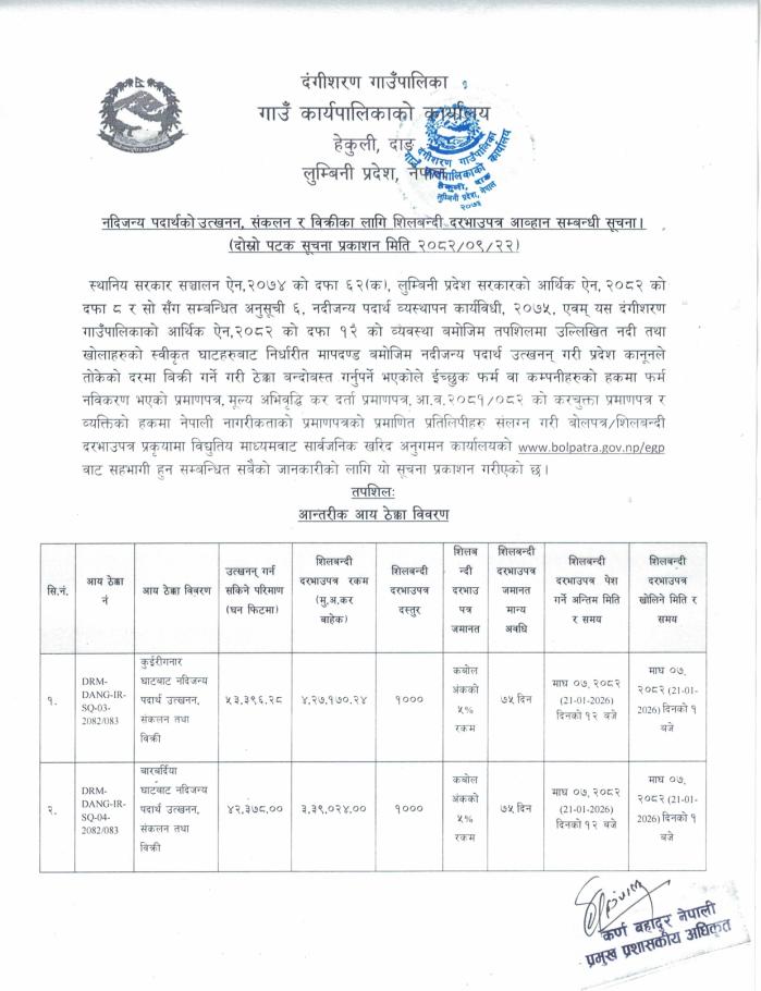 नदीजन्य पदार्थको उत्खनन्, संकलन र विक्रीका लागि बोलपत्र / शिलबन्दी दरभाउपत्र आव्हान सम्बन्धी सूचना (दोश्रो पटक प्रकाशित) ।