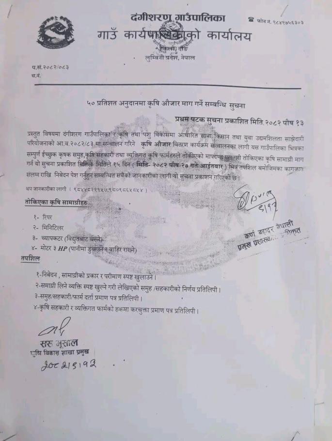 ५० प्रतिशत अनुदानमा कृषि औजार माग गर्ने सम्बन्धि सुचना ।।।