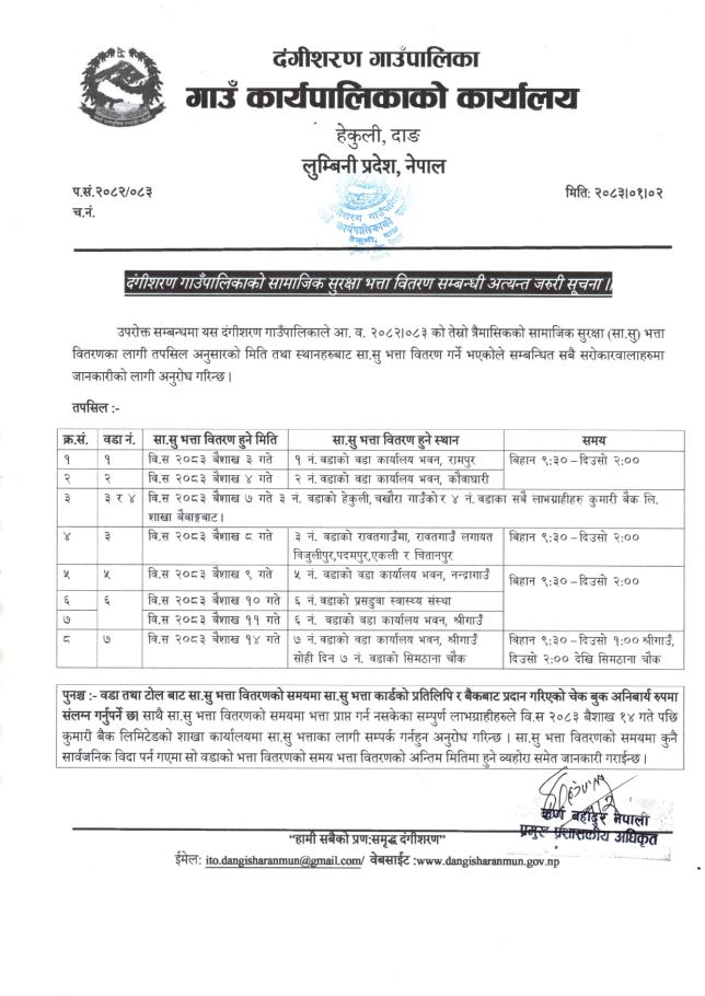 दंगीशरण गाउँपालिका दाङको आ.व. २०८२/८३ को तेश्रो त्रैमासिक सामाजिक सुरक्षा भत्ता वितरण सम्बन्धी सूचना ।