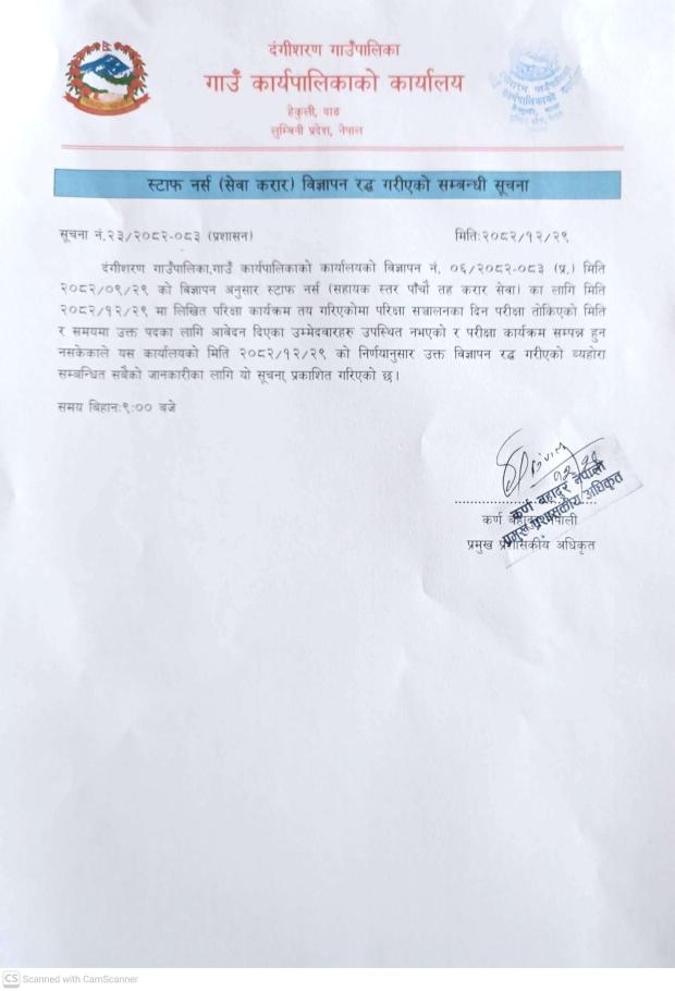 स्टाफ नर्स (सेवा करार) विज्ञापन रद्ध गरिएको सम्बन्धी सूचना ।